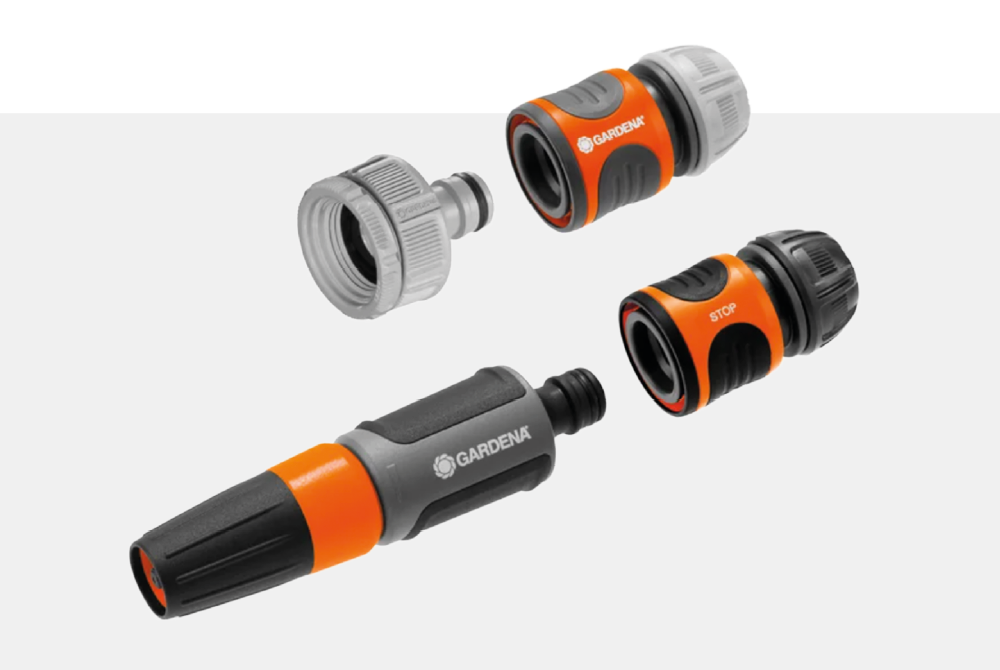 Das Basisset mit Classic-Spritzlanze Gardena beinhaltet eine Hahnverbinder mit Adapter, Schlauchverbinder und Wasserstop. Ideal für 13 mm (1/2 Zoll)- und 15 mm (5/8 Zoll)-Schläuche.