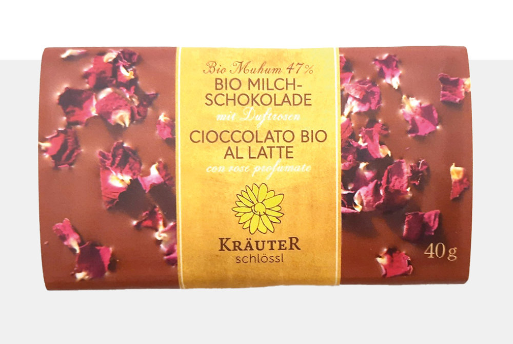 Cioccolato al latte bio (BIO Muhum) con fior di rose del Kräuterschlössl.
